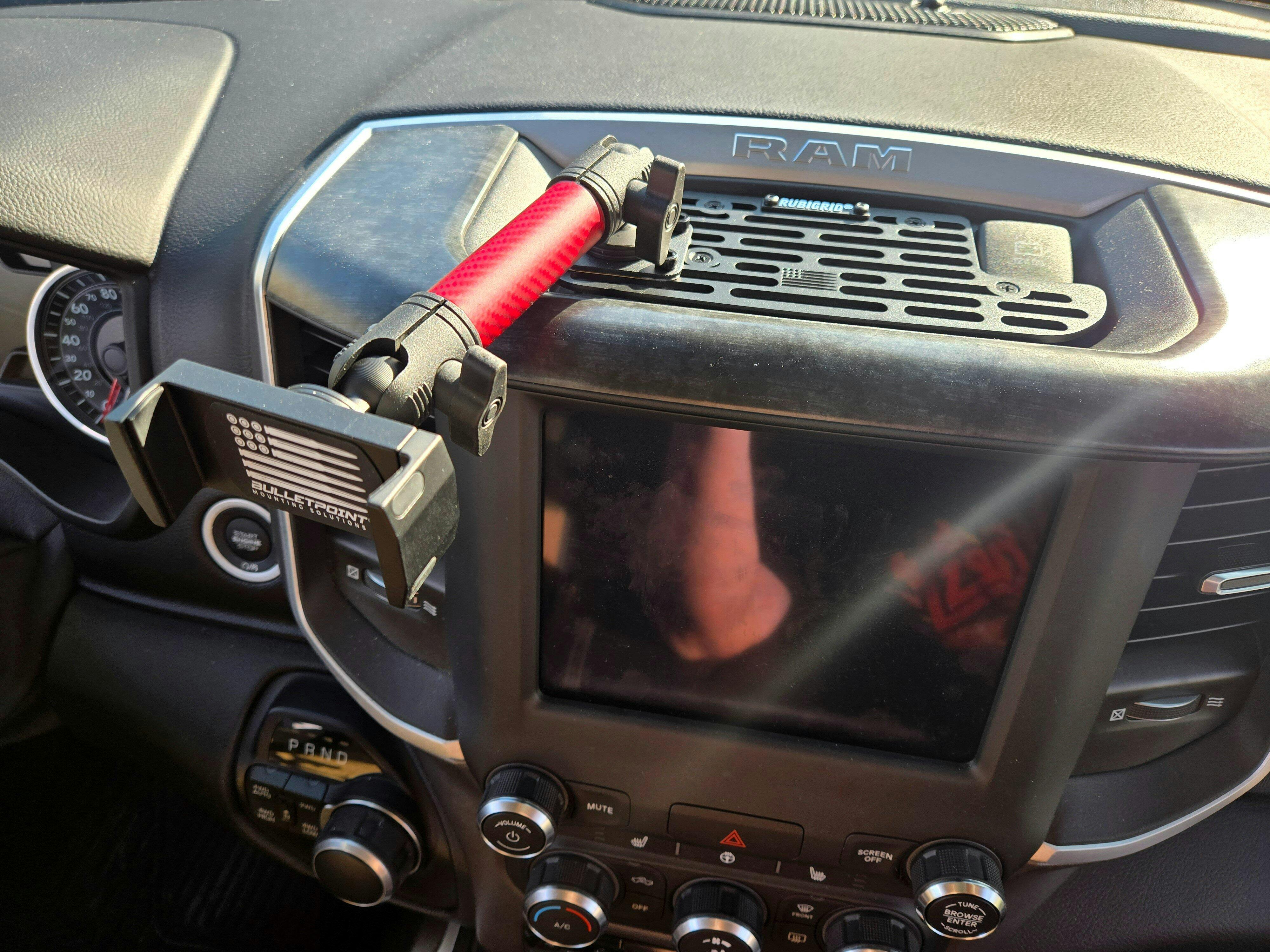 Our RubiGrid® dash mount for the 2019+ RAM Truck has the look and feel of a factory-installed option. It follows the lines of the dash tray opening while still allowing access to the dash-mounted 12V outlet.