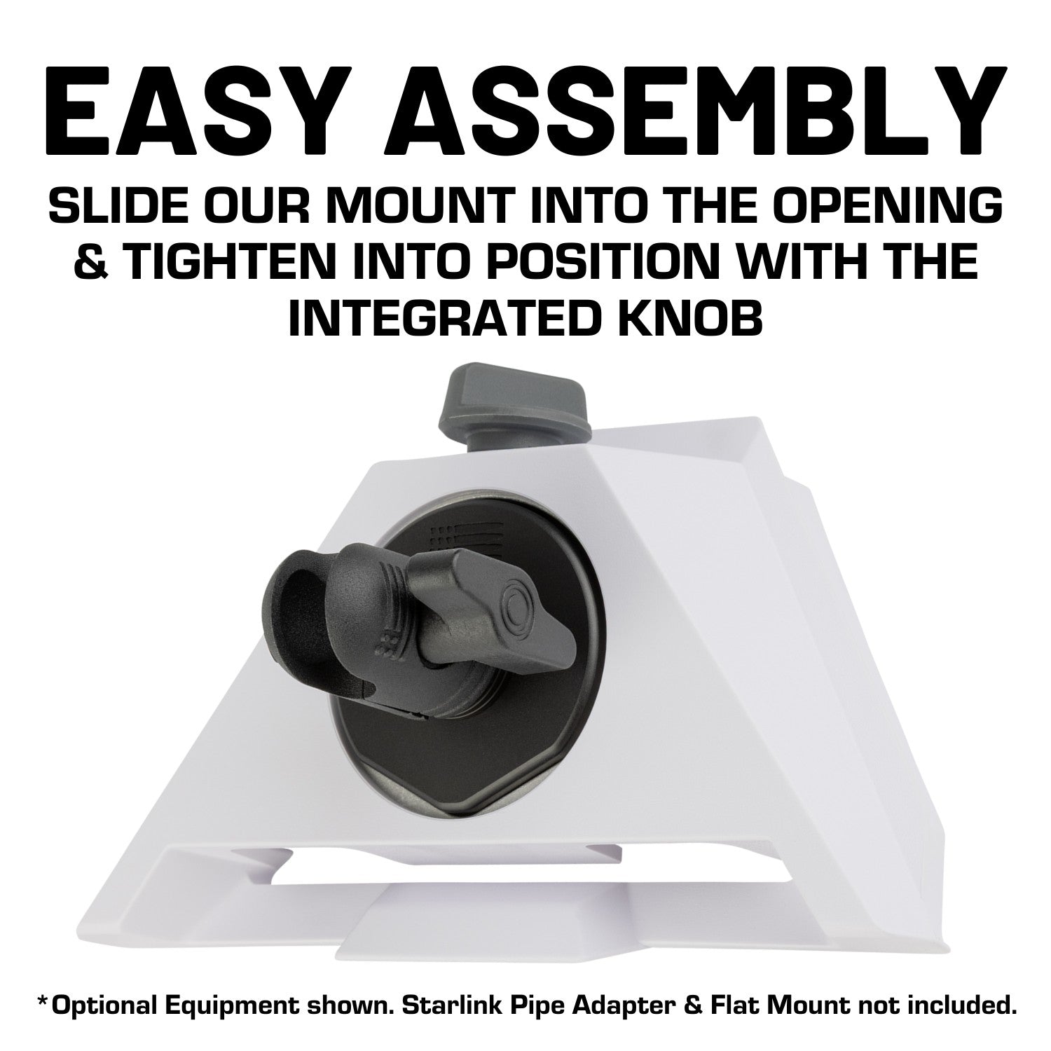 Our mount is designed for fast installation, easy repositioning and quick removal. Simply slide the mount into the Pipe Adapter and Flat Mount (sold separately & included with your Starlink Mini) and secure it with the hex-head bolt. It's that easy to set up base camp or tear it down when you're ready to to hit the road.