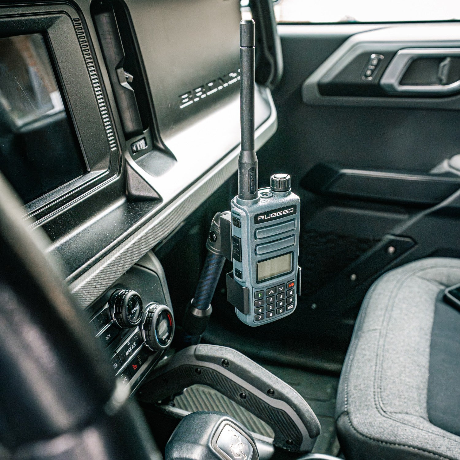 This center console mount is the perfect addition to a complete Bronco Command Center setup. While it works great as a standalone, low-profile mount, it pairs perfectly with the rest of our Bronco lineup including our Bronco RubiGrid® dash mount, Accessory Ready Single Device mount, hardtop roof panel mount and more.