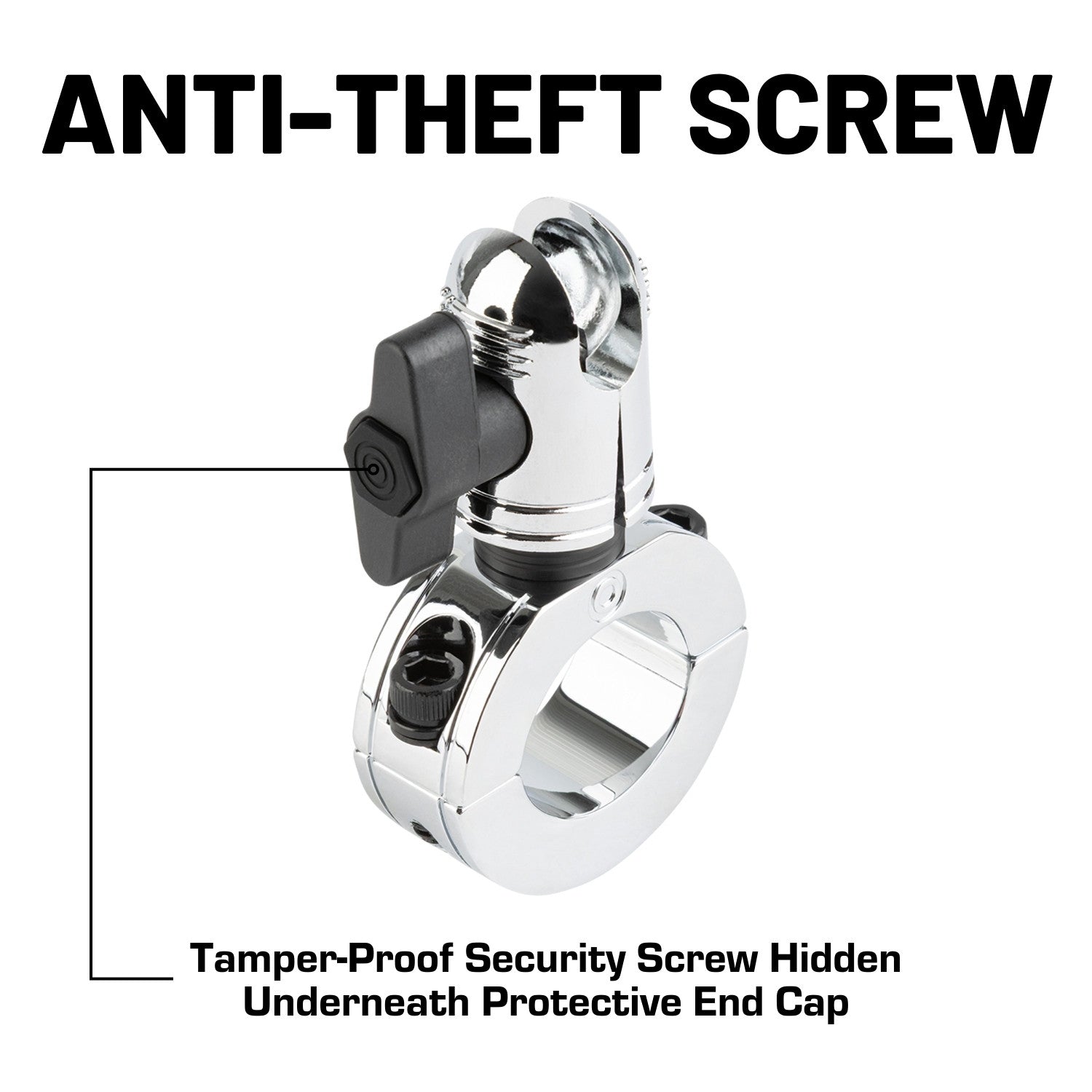 The integrated thumbscrew features a concealed security screw hidden beneath a protective end cap. This tamper-resistant design makes it significantly harder for opportunistic thieves to remove your device holder.