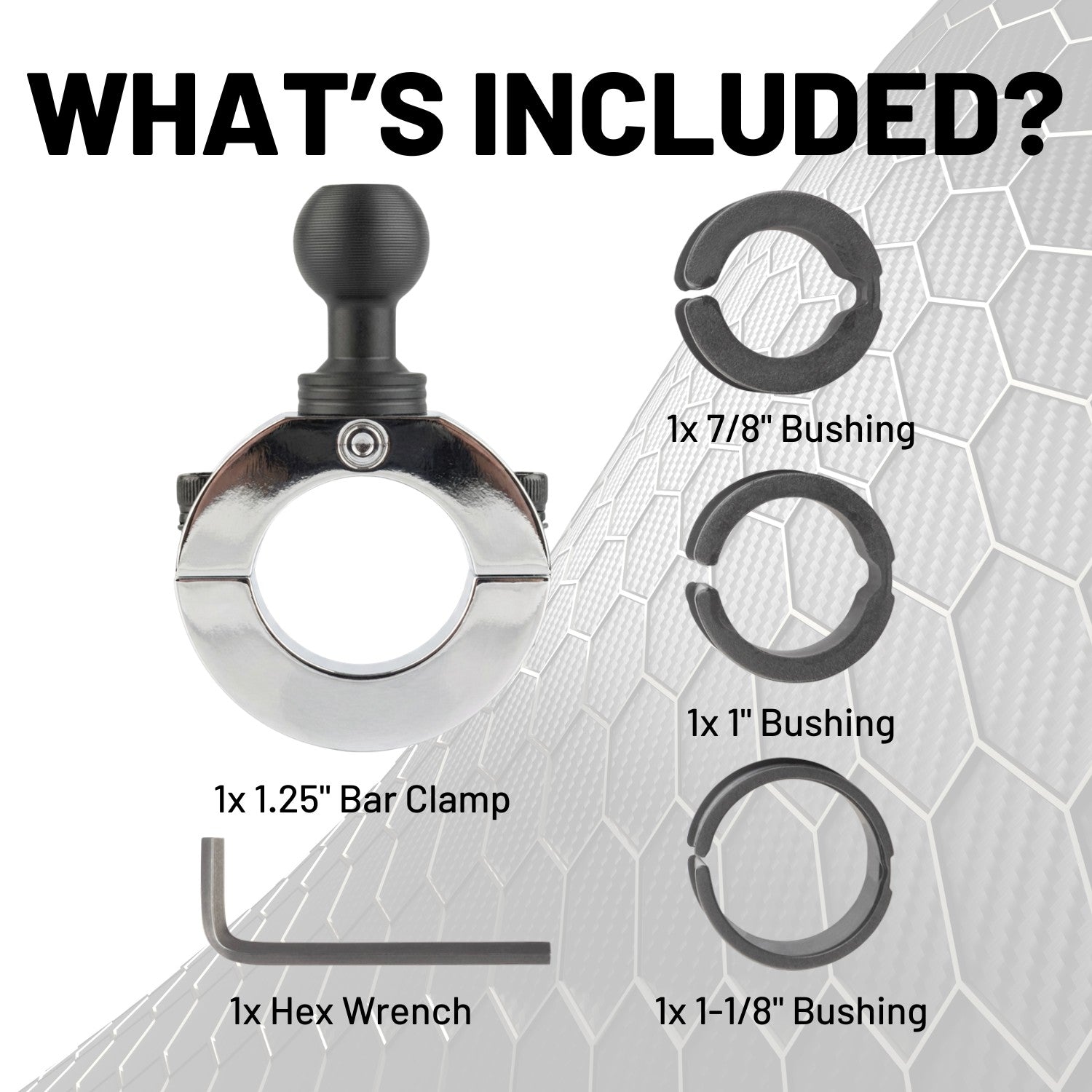 Designed to not only securely mount your device but to perfectly complement your vehicle's chrome aesthetic without detracting from it. This modular bar clamp is engineered to fit bars from 7/8" up to 1.25" thanks to the included ABS bushings.