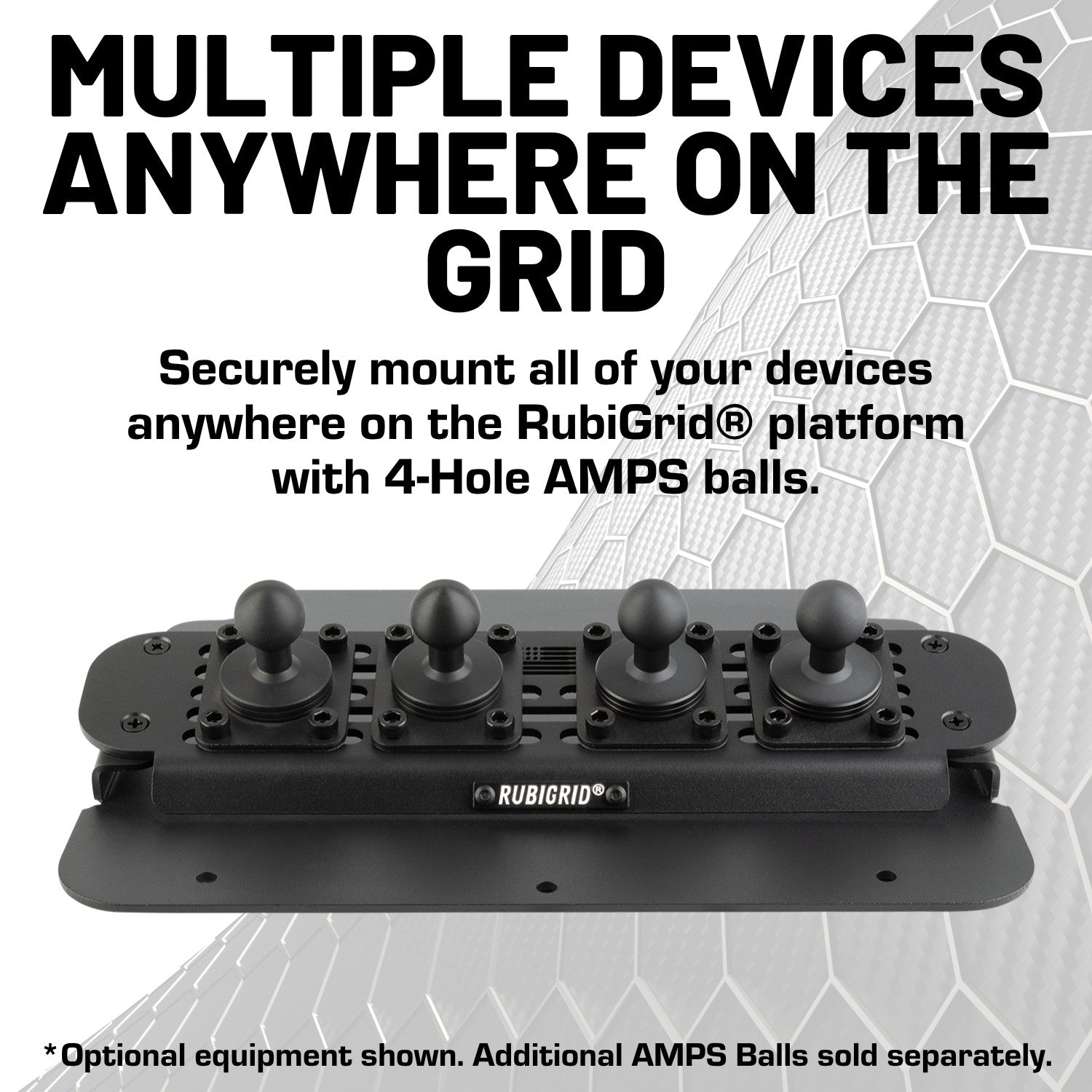 RubiGrid® is much more than just a phone holder – it's our most versatile device mounting platform. It is a fully modular system that utilizes a grid-style base, allowing you to attach 4-Hole AMPS balls wherever you need them.