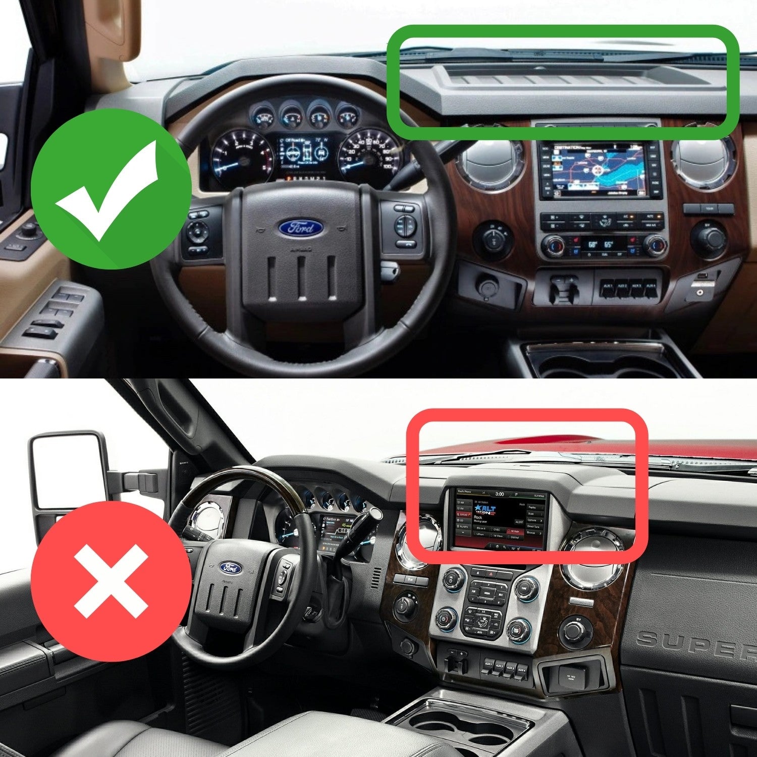 Our bases are only compatible with 2008-2016 Ford® Super Duty Trucks with the flat, ribbed dash indicated with the green checkmark.