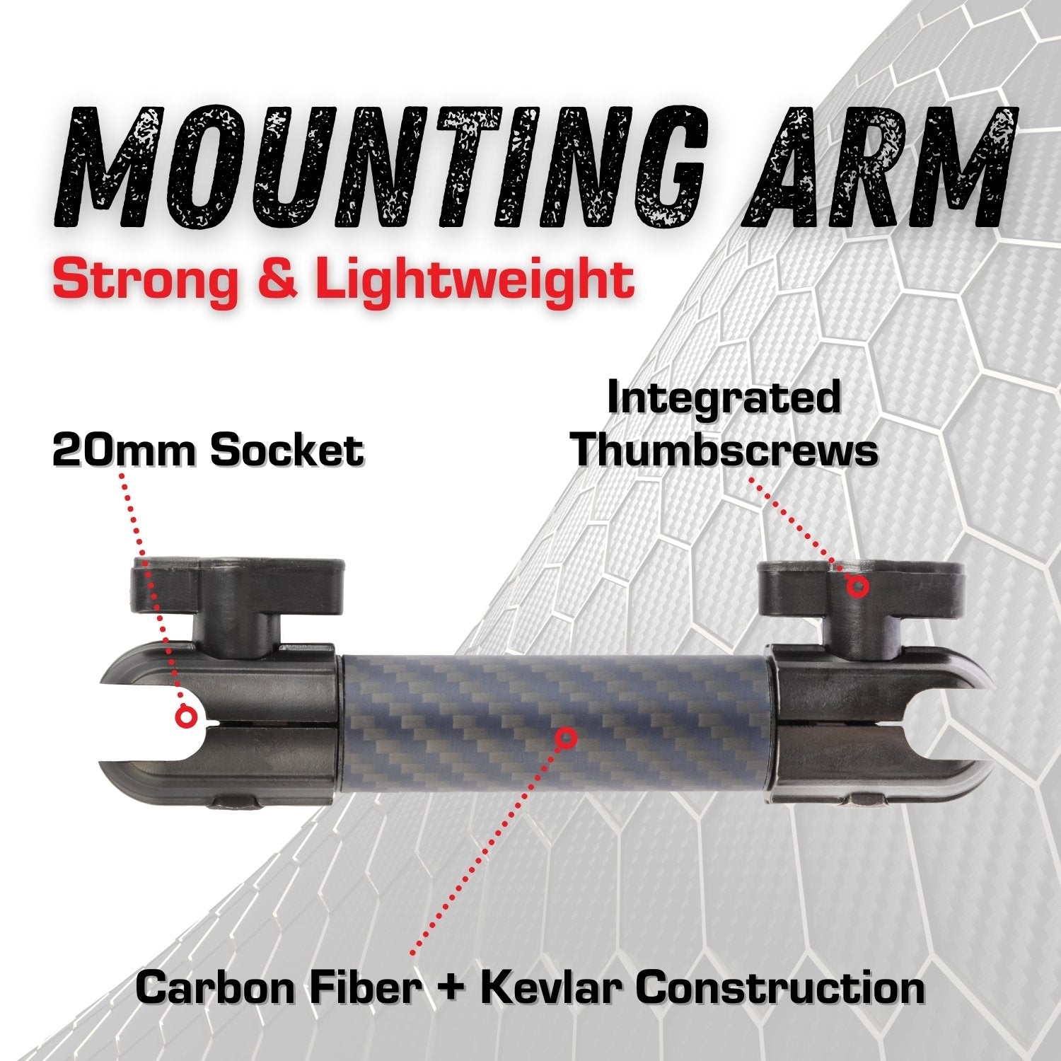 The Carbon Fiber + Kevlar arm connects to the base and your device holder for a rock solid mounting solution.