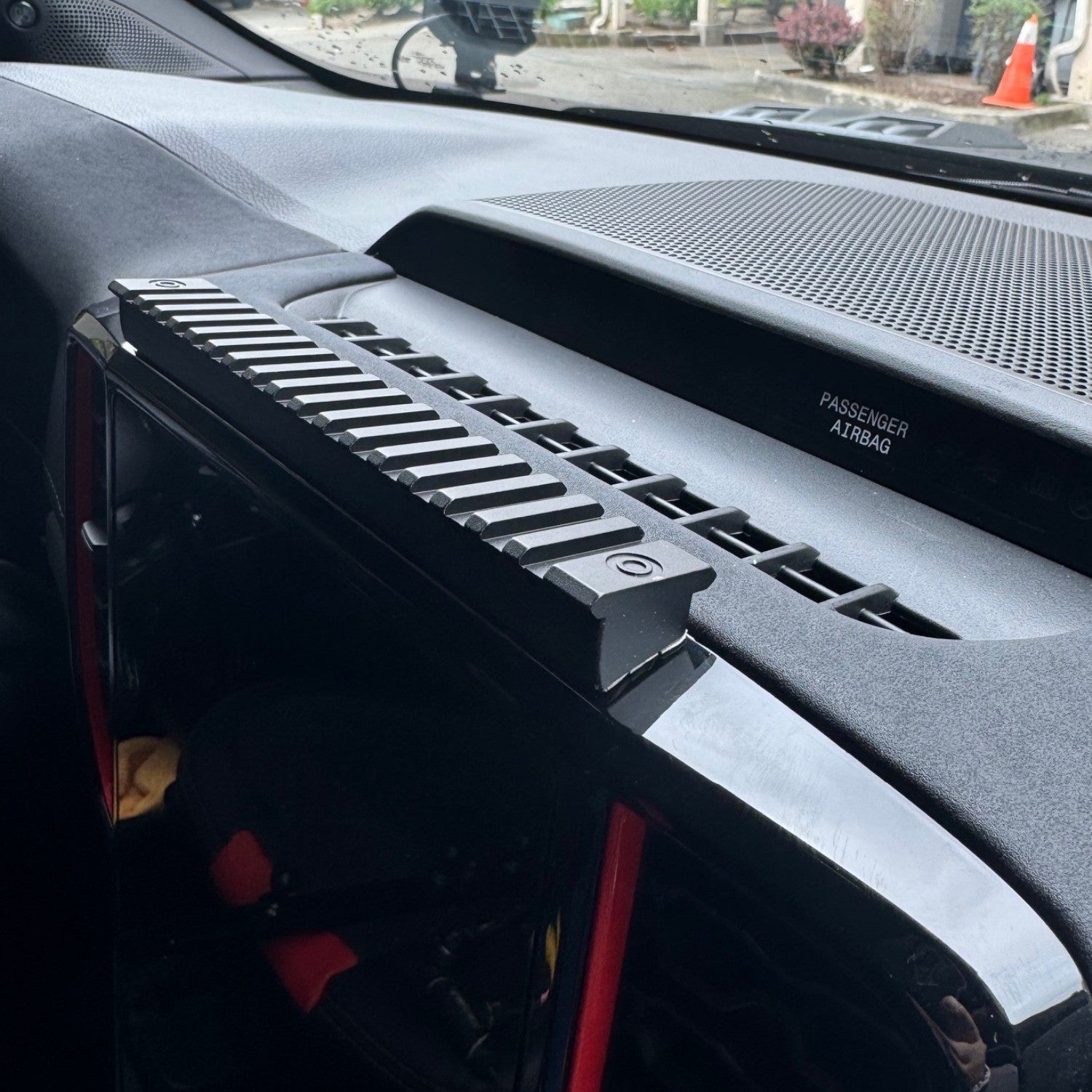 Our Picatinny-style rail mount installs using 2 original bolts already found on your vehicle's dash – 100% bolt-on without any drilling or modifications required.