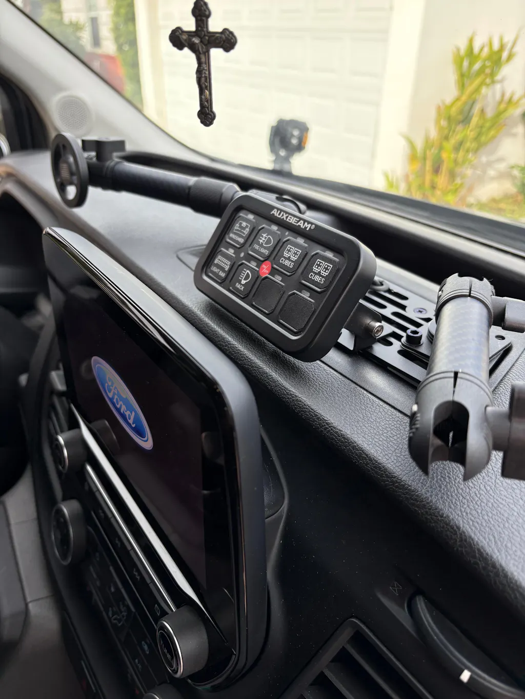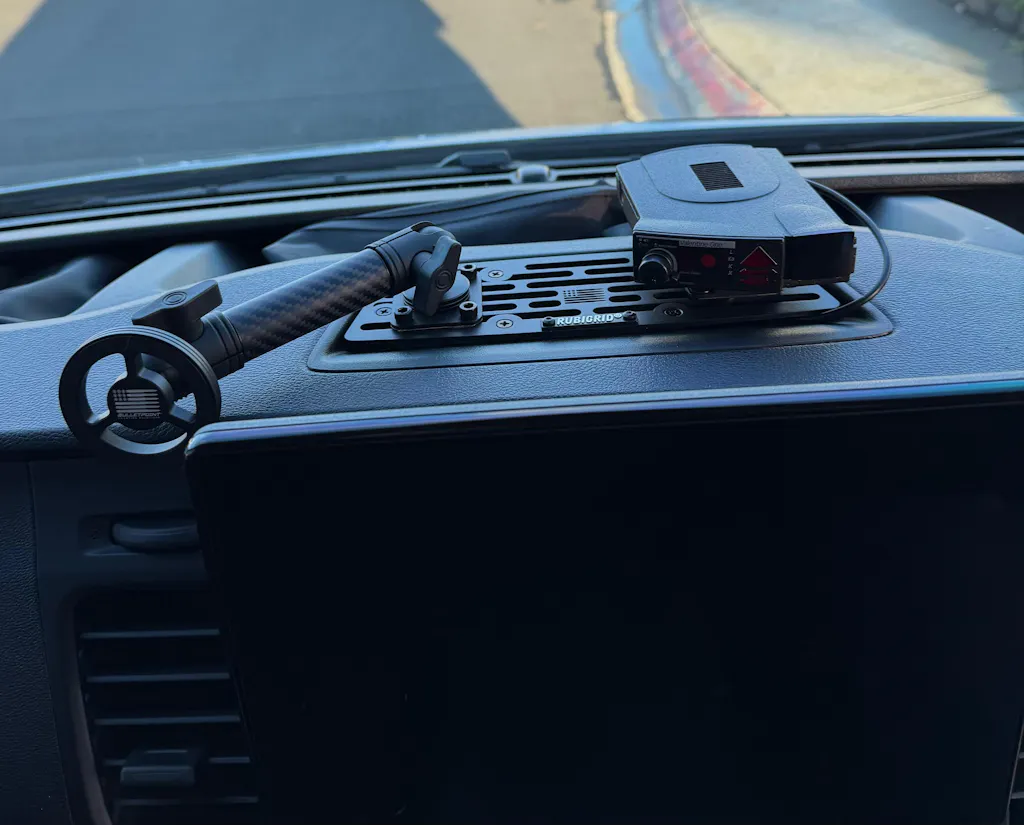 The RubiGrid® Dash Mount installs using the included 5 bolts, nuts and washers directly on to the dash tray resulting in rock solid base to securely mount all of your devices.
