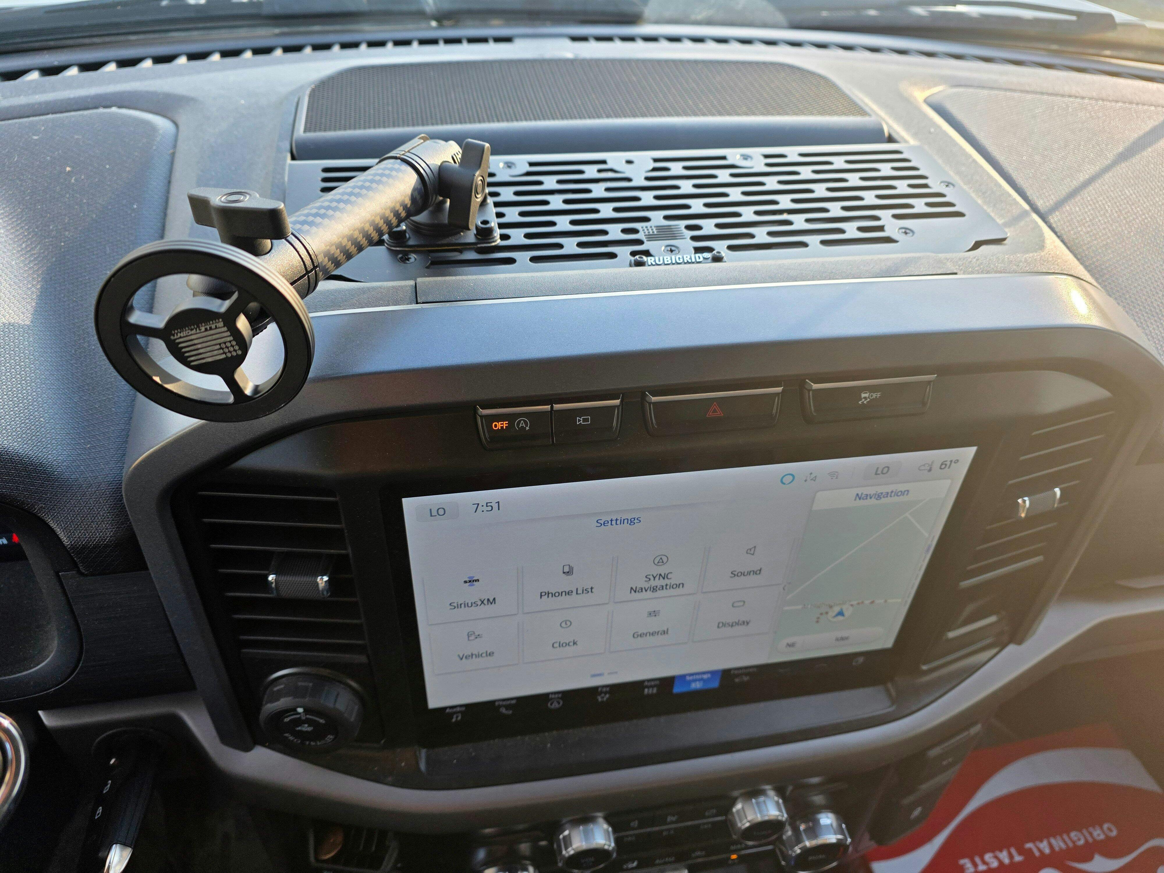 Our RubiGrid® dash mount for the 2021-2024 F-150 & F-150 Raptor has the look and feel of a factory-installed option following the lines of the dash tray opening.