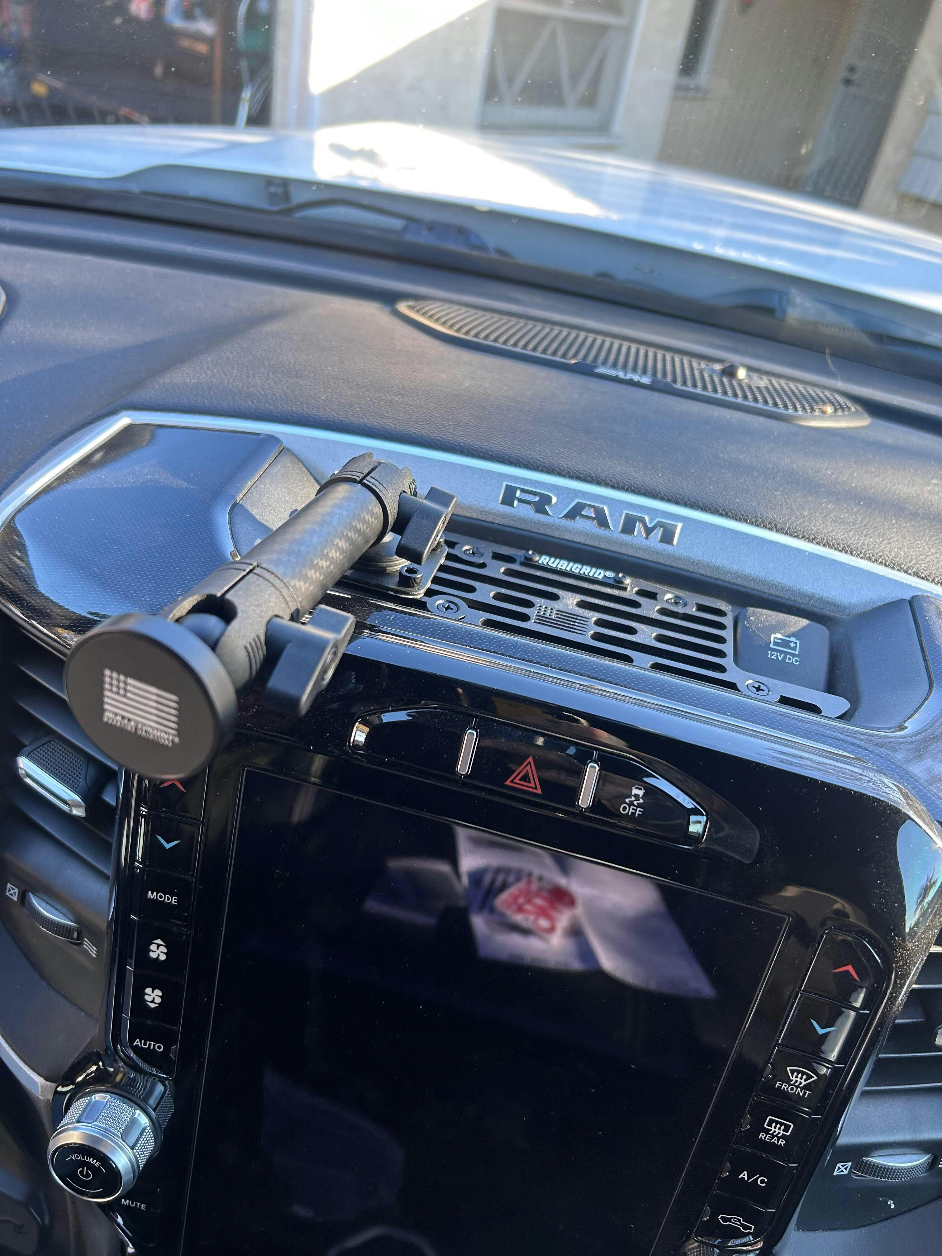 Our RubiGrid® dash mount for the 2019+ RAM Truck has the look and feel of a factory-installed option. It follows the lines of the dash tray opening while still allowing access to the dash-mounted 12V outlet.